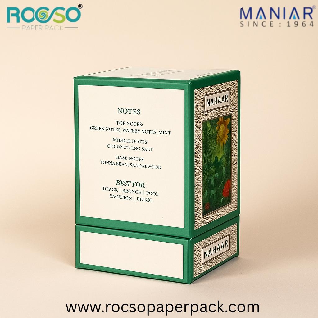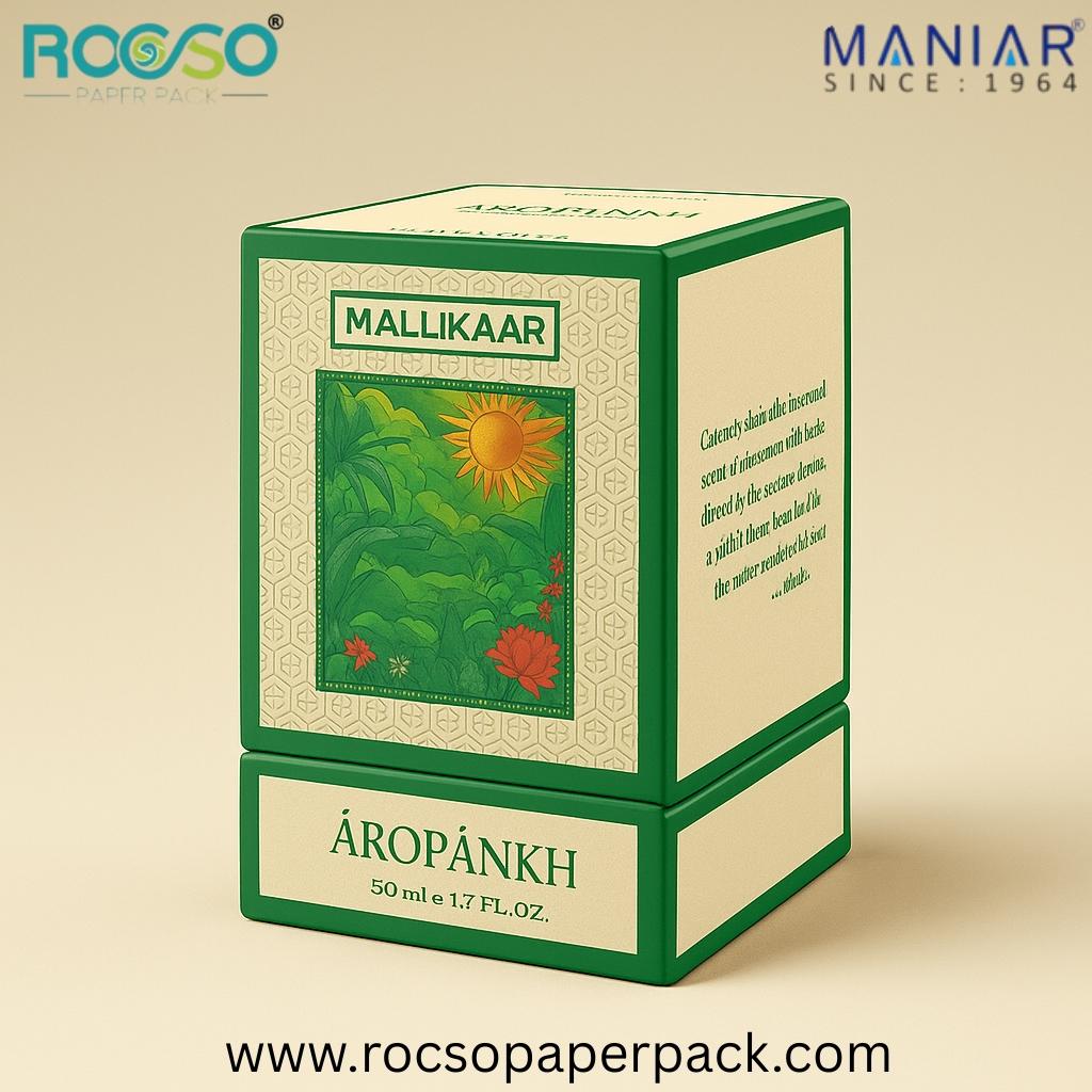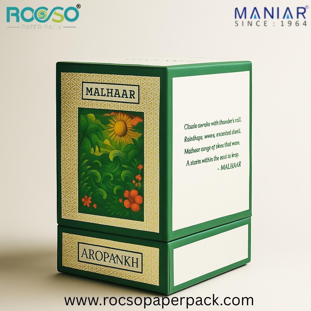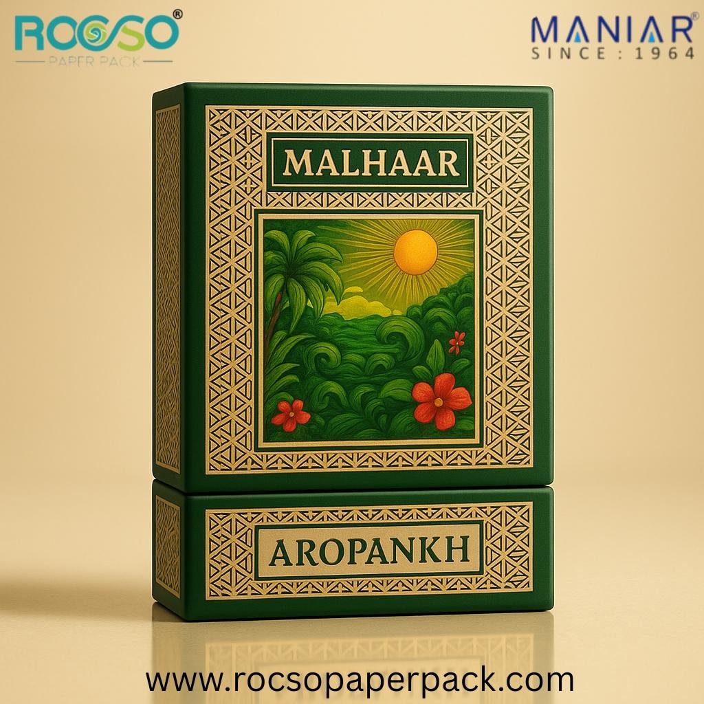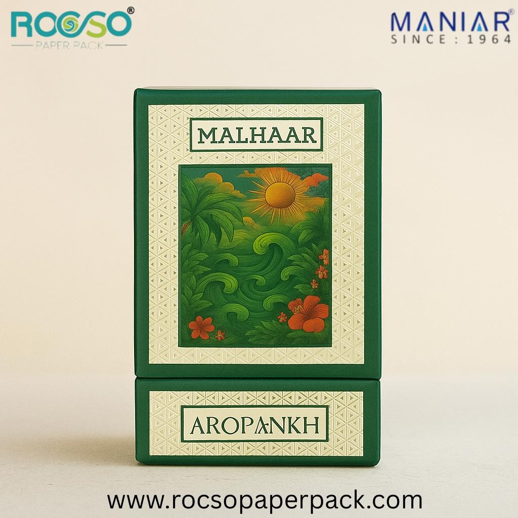 Malhaar – Aropankh ek nature-inspired luxury rigid box hai, jisme premium matte finish, intricate golden emboss, aur vibrant artwork ka perfect combination diya gaya hai. Ideal for perfumes, gifting, wellness aur artisanal brands.