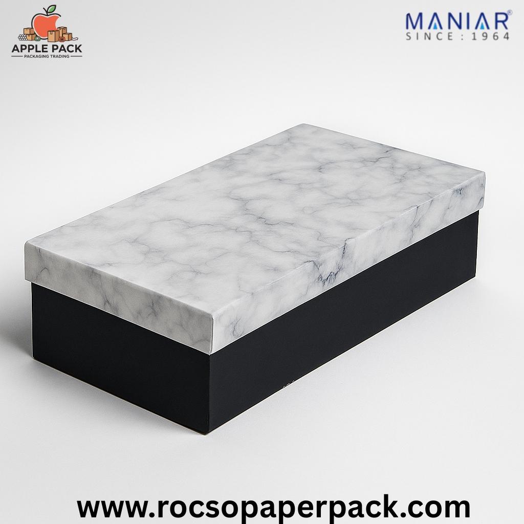 A luxurious rectangular rigid box featuring an elegant white marble texture lid paired with a matte black base, offering a timeless and sophisticated look. Perfect for gifting, premium packaging, or branded product presentation, this box is designed to enhance the perceived value of your product.